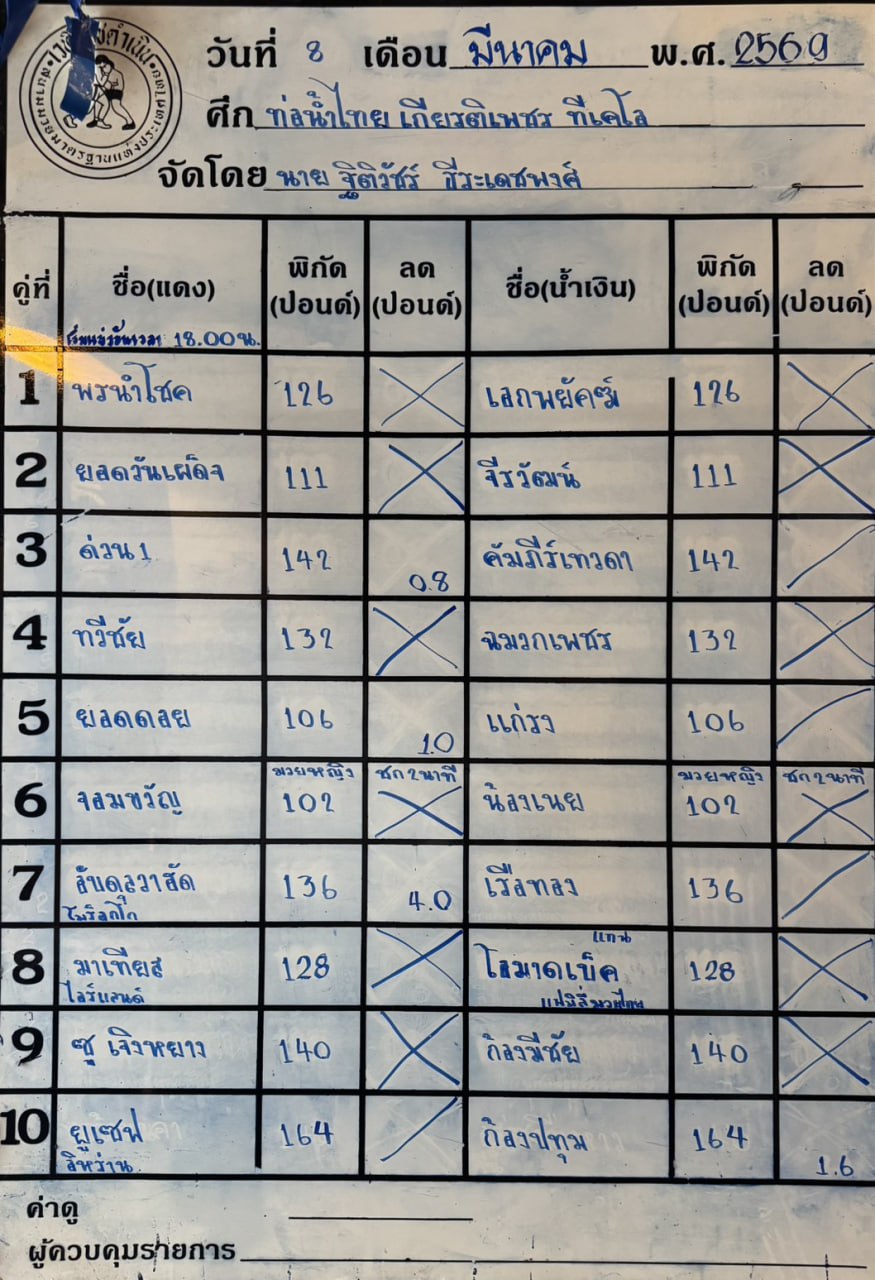 สิ่งแรกที่นักกีฬาต้องทำคือ การตรวจเช็กร่างกายและชั่งน้ำหนัก ขั้นตอนนี้มีความสำคัญมาก เพราะการแข่งขันแต่ละไฟต์จะถูกกำหนดตามรุ่นน้ำหนัก หากน้ำหนักเกินเกณฑ์ที่กำหนดอาจทำให้เสียสิทธิ์ในการแข่งขันได้ นักกีฬาจึงต้องควบคุมอาหารและดูแลร่างกายล่วงหน้าหลายวันก่อนถึงวันจริง